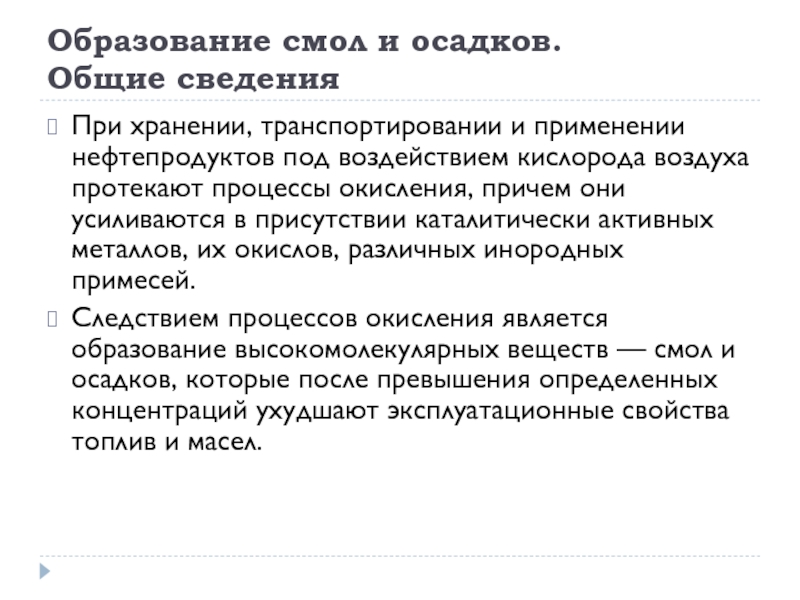 Следствием процессов окисления является образование высокомолекулярных веществ — смол и осадков, которые после превышения определенных концентраций ухудшают эксплуатационные свойства топлив и масел.