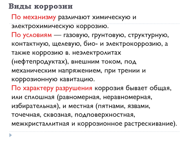 — газовую, грунтовую, структурную, контактную, щелевую, био- и электрокоррозию, а