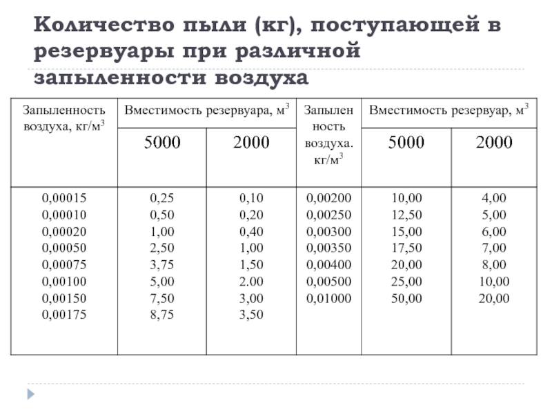 Слайд 13Количество пыли (кг), поступающей в резервуары при различной запыленности воздуха