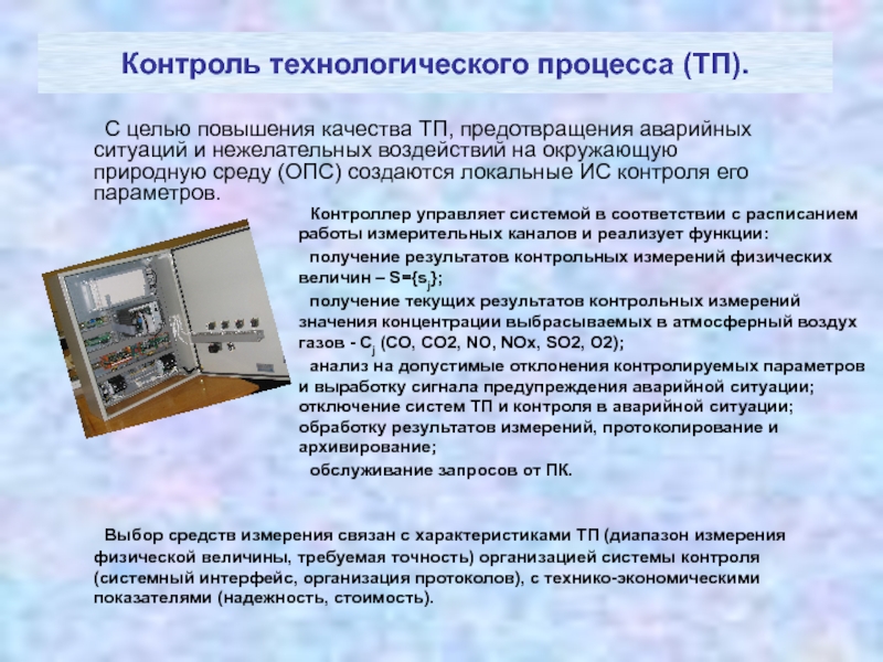 Структура локальной ИВС контроля ТП	Локальная ИС обеспечивает контроль важных технологических и экологических параметров, производит расчет степени воздействия