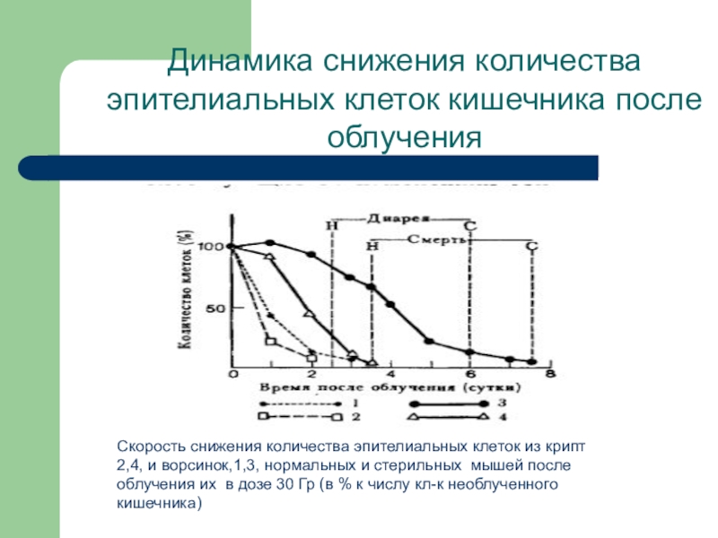 Слайд 25Скорость снижения количества эпителиальных клеток из крипт 2,4, и ворсинок,1,3,