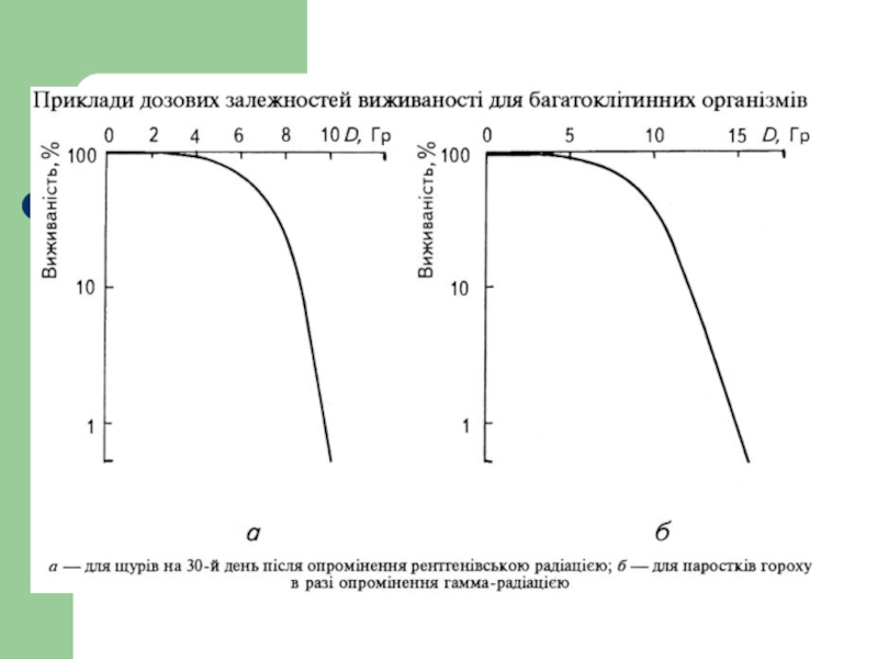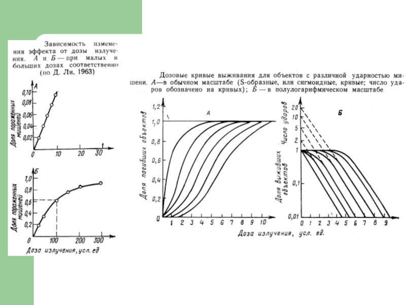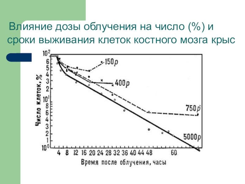 Слайд 23 Влияние дозы облучения на число (%) и сроки выживания