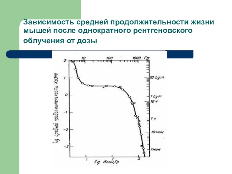 Слайд 10Зависимость средней продолжительности жизни мышей после однократного рентгеновского облучения от