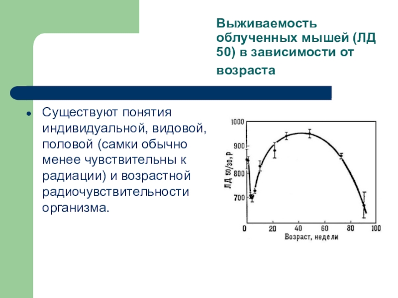 Слайд 20Выживаемость облученных мышей (ЛД 50) в зависимости от возраста