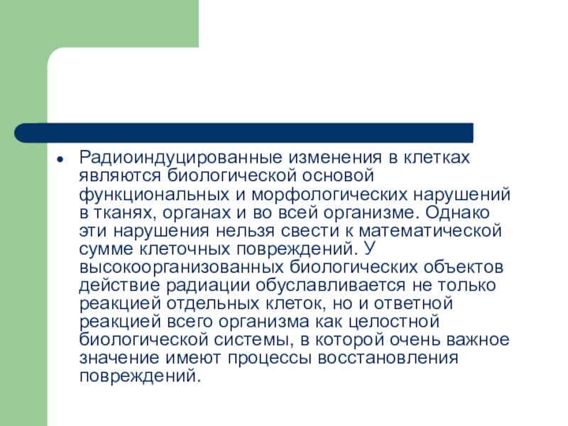 нарушения нельзя свести к математической сумме клеточных повреждений. У высокоорганизованных биологических объектов действие радиации обуславливается не только реакцией отдельных клеток, но и ответной реакцией всего организма как целостной биологической системы, в которой очень важное значение имеют процессы восстановления повреждений.
