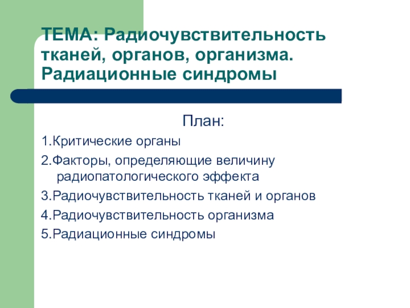 Слайд 2ТЕМА: Радиочувствительность тканей, органов, организма. Радиационные синдромы
