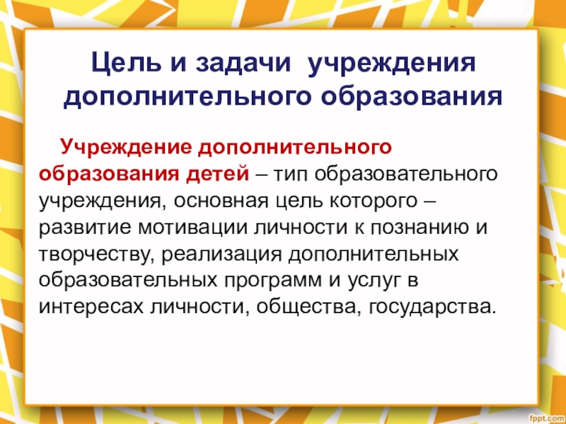 Слайд 6Цель и задачи учреждения дополнительного образования
