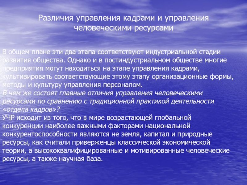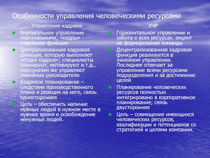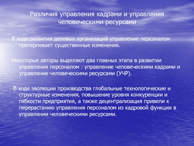 главных этапа в развитии управления персоналом : управление человеческими кадрами и управление человеческими ресурсами (УЧР).