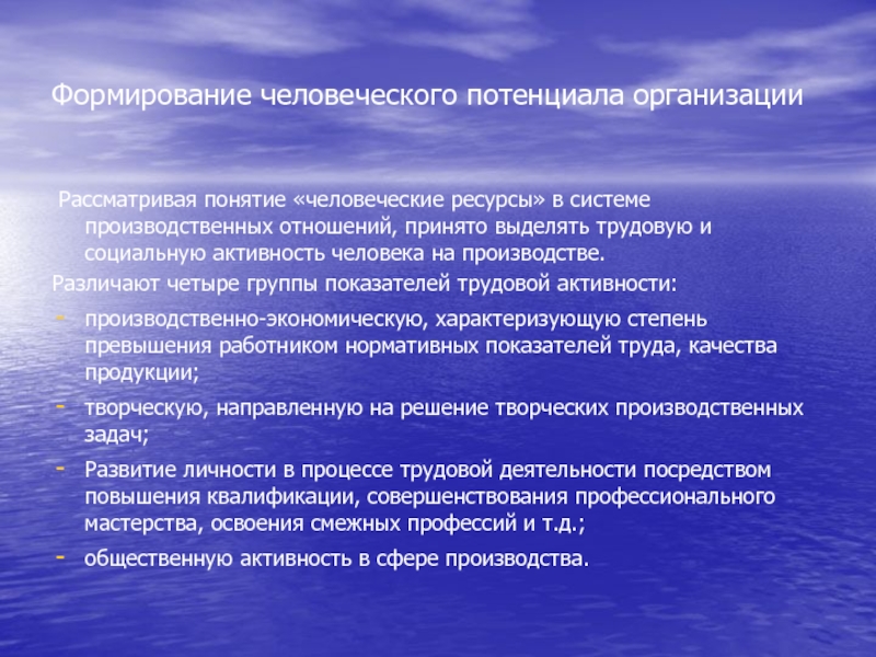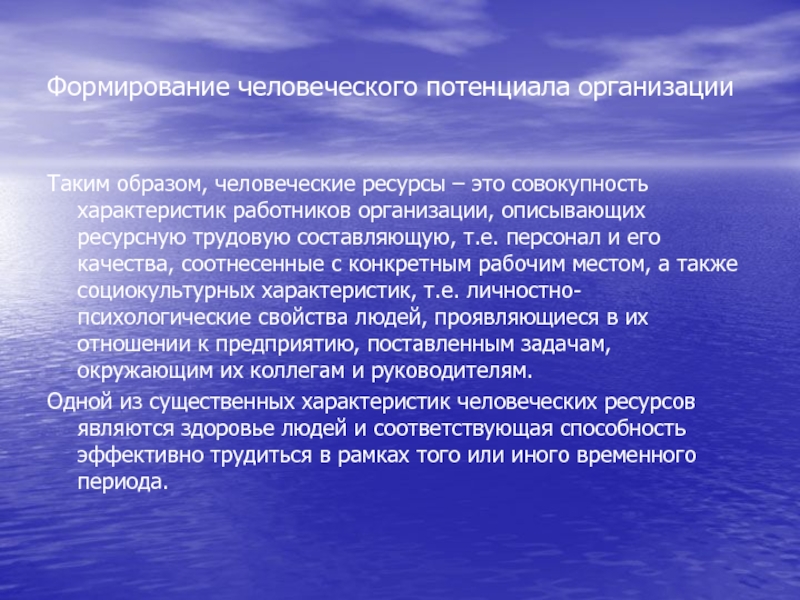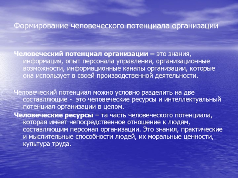 Человеческие ресурсы – та часть человеческого потенциала, которая имеет непосредственное отношение к людям, составляющим персонал организации. Это знания, практические и мыслительные способности людей, их моральные ценности, культура труда.