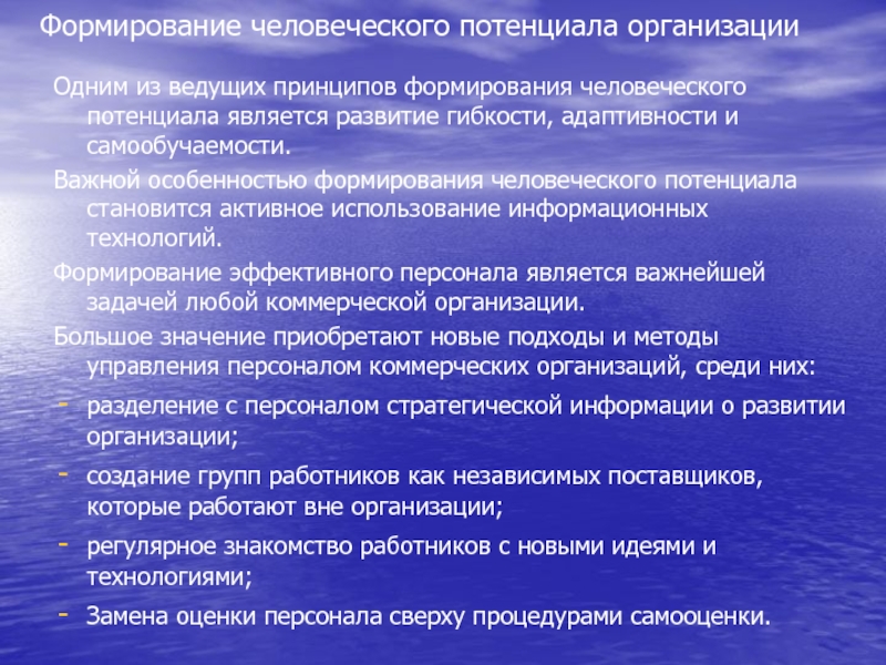 Большое значение приобретают новые подходы и методы управления персоналом коммерческих организаций, среди них: