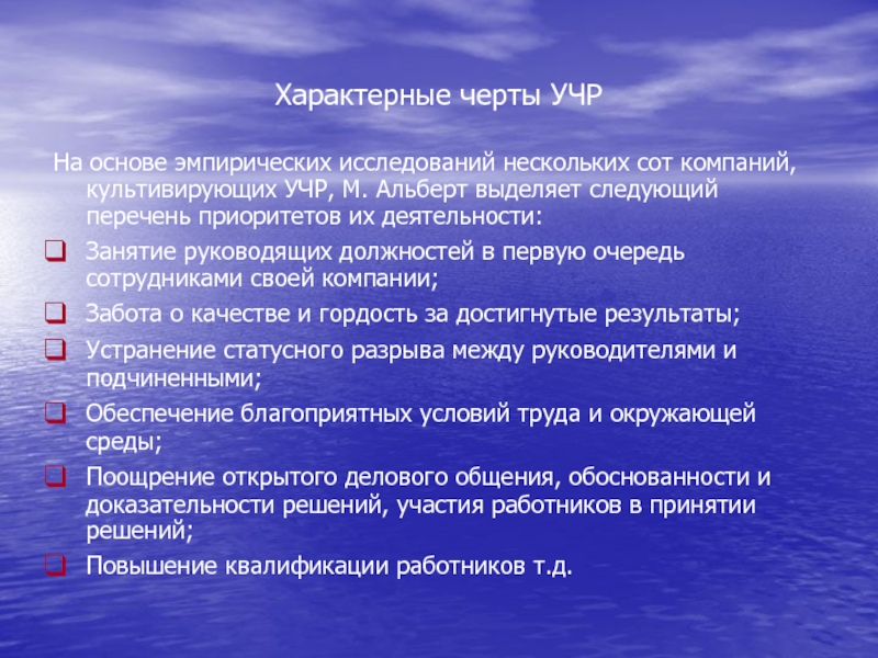 УЧР, М. Альберт выделяет следующий перечень приоритетов их деятельности: