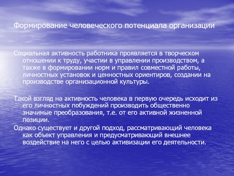 Однако существует и другой подход, рассматривающий человека как объект управления и предусматривающий внешнее воздействие на него с целью активизации его деятельности.