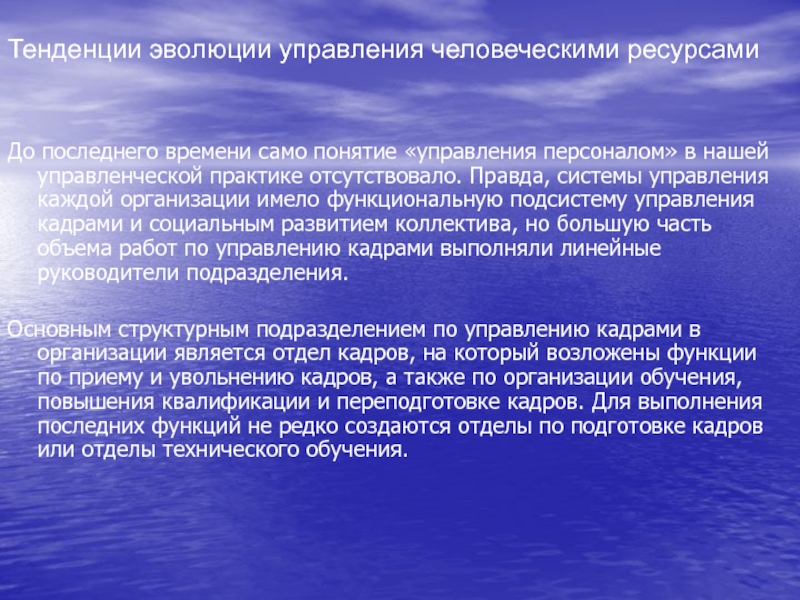 В ходе эволюции производства глобальные технологические и структурные изменения, повышение уровня конкуренции и гибкости предприятия, а также децентрализация привели к перерастанию управления персоналом из кадровой функции в управлении человеческими ресурсами.