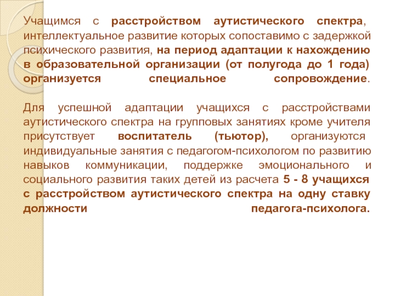 Для успешной адаптации учащихся с расстройствами аутистического спектра на групповых занятиях кроме учителя присутствует воспитатель (тьютор), организуются индивидуальные занятия с педагогом-психологом по развитию навыков коммуникации, поддержке эмоционального и социального развития таких детей из расчета 5 - 8 учащихся с расстройством аутистического спектра на одну ставку должности педагога-психолога.