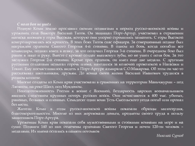 Неподготовленность России к войне с Японией, бездарность царских военачальников явились следствием крупных потерь русских войск. Они исчисляются в 400 тыс. убитых, раненых, больных и пленных. Семьдесят один воин Усть-Сысольского уезда погиб или пропал без вести.
