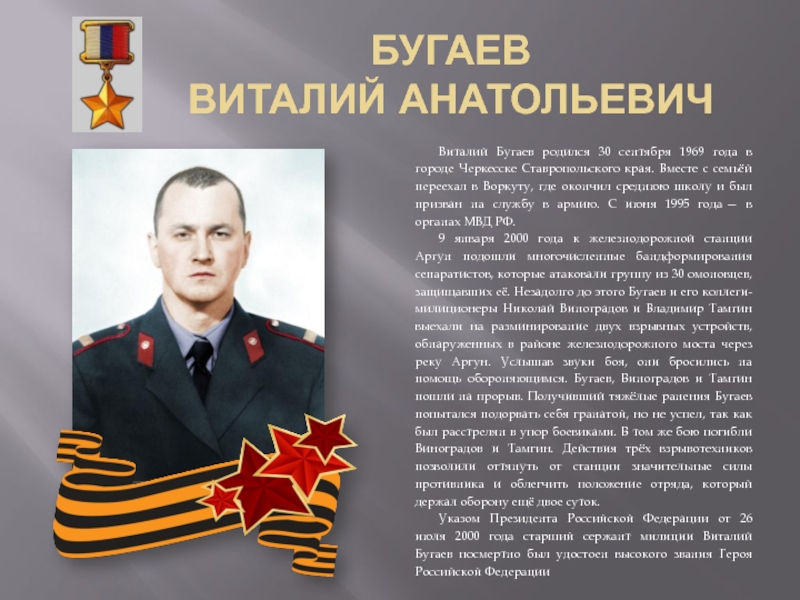 Указом Президента Российской Федерации от 26 июля 2000 года старший сержант милиции Виталий Бугаев посмертно был удостоен высокого звания Героя Российской Федерации