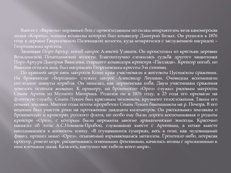По крайней мере пять матросов Коми края участвовали в жестоком Цусимском сражении. На броненосце «Бородино» служил матрос Александр Леушин. Очевидцы вспоминали последние минуты корабля. Он запылал, как деревенская изба. Двум участникам сражения довелось остаться живыми. К примеру, на броненосце «Орел» служил рядовым матросом Семен Артеев из Мутного Материка. Родился он в 1876 году, в 23 года его призвали на флотскую службу. Семен Лукич был красивым человеком, крупного телосложения. Таким его помнят земляки. Многие годы потом проработал Семен Лукич бакенщиком на р. Печора. В его ведении был участок реки на протяжении двадцати километров. Он рассказывал землякам о броненосцах и крейсерах русского флота, но особо ему были дороги воспоминания о родном крейсере «Орел», с которым были пережиты многие драматические эпизоды. Красочно написал об этом А.С.Новиков-Прибой, служивший вместе с Артеевым, а позже вместе находившийся в японском плену. «В сгущавшихся сумерках, весь в огне, как чудовищный факел, прошел мимо «Орел», осыпаемый взрывающимся металлом. Грохотало небо, потрясая простор, ревело море, расцвечиваясь огненными фонтанами, качались волны с прилипшими к ним клочьями дыма. Казалось, наступил час гибели всего мира».
