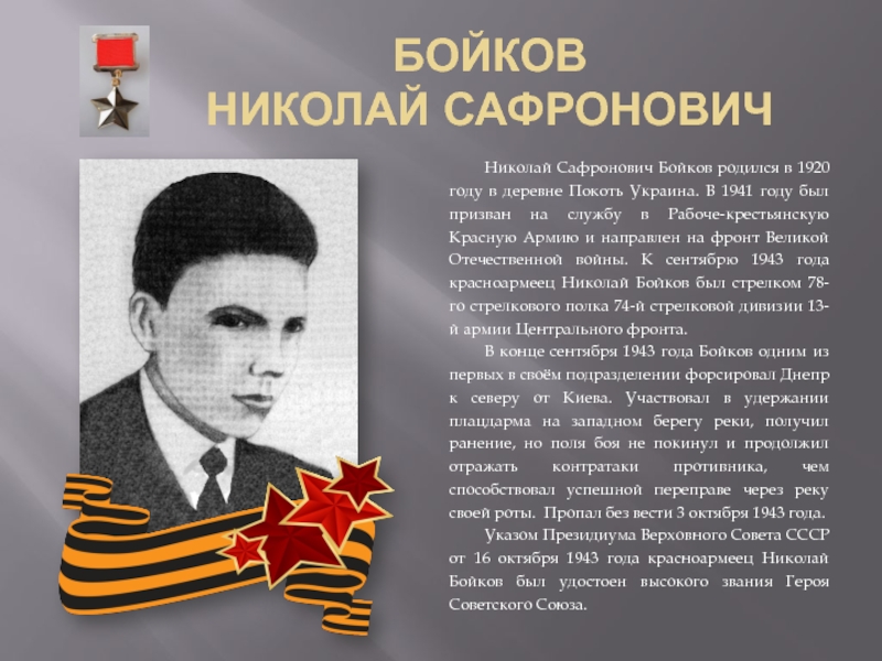 в Рабоче-крестьянскую Красную Армию и направлен на фронт Великой Отечественной войны. К сентябрю 1943 года красноармеец Николай Бойков был стрелком 78-го стрелкового полка 74-й стрелковой дивизии 13-й армии Центрального фронта.