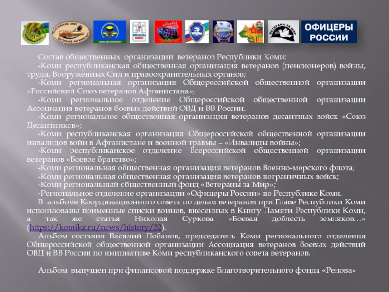 Альбом составил Василий Лобанов, председатель Коми регионального отделения Общероссийской общественной организации Ассоциация ветеранов боевых действий ОВД и ВВ России по инициативе Коми республиканского совета ветеранов.