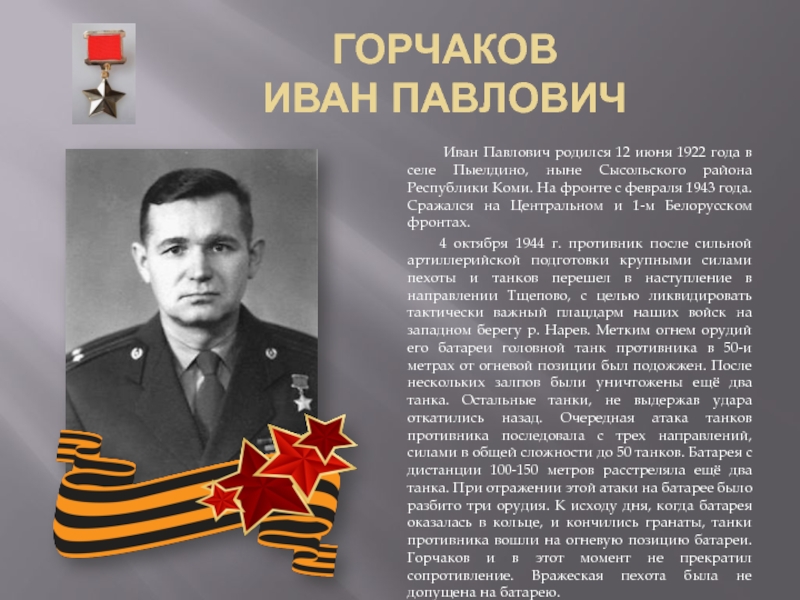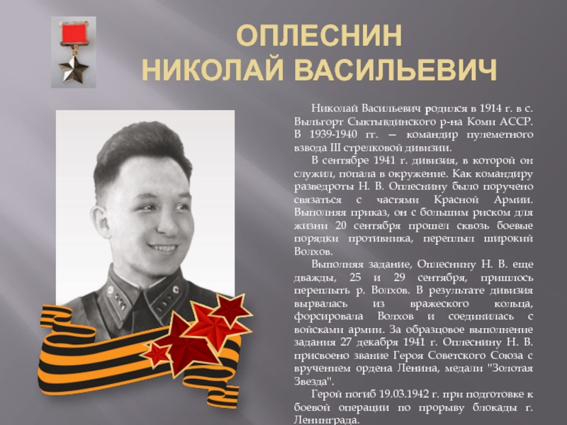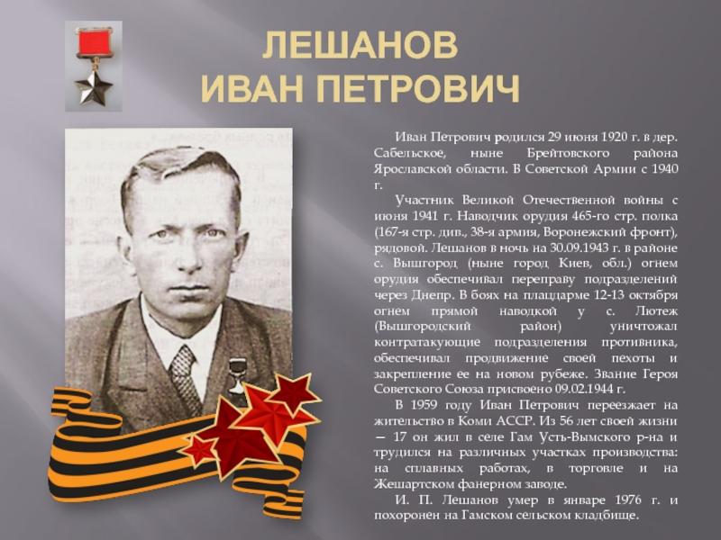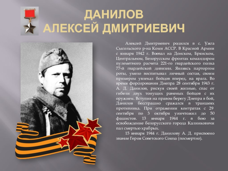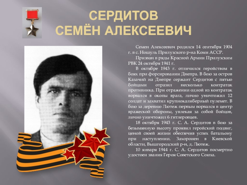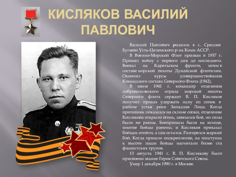 Усть-Цилемского района Коми АССР. Ушел на фронт добровольцем в августе 1942 г. Участвовал в боях на Волховском и Ленинградском фронтах.