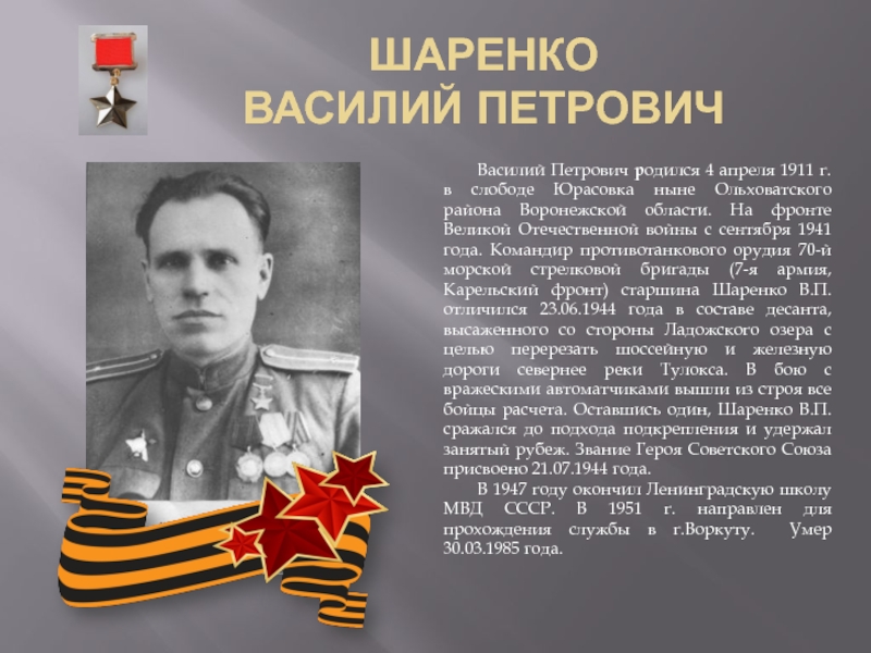 Отечественной войны с сентября 1941 года. Командир противотанкового орудия 70-й морской стрелковой бригады (7-я армия, Карельский фронт) старшина Шаренко В.П. отличился 23.06.1944 года в составе десанта, высаженного со стороны Ладожского озера с целью перерезать шоссейную и железную дороги севернее реки Тулокса. В бою с вражескими автоматчиками вышли из строя все бойцы расчета. Оставшись один, Шаренко В.П. сражался до подхода подкрепления и удержал занятый рубеж. Звание Героя Советского Союза присвоено 21.07.1944 года.