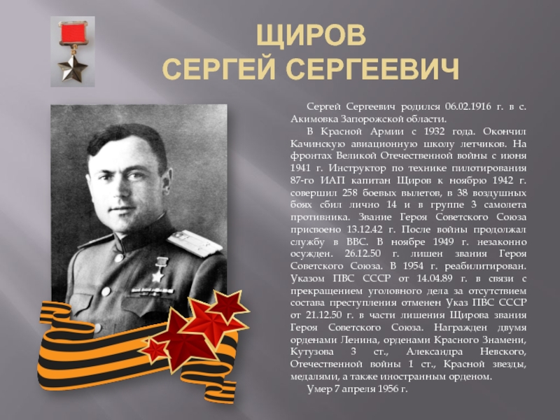 авиационную школу летчиков. На фронтах Великой Отечественной войны с июня 1941 г. Инструктор по технике пилотирования 87-го ИАП капитан Щиров к ноябрю 1942 г. совершил 258 боевых вылетов, в 38 воздушных боях сбил лично 14 и в группе 3 самолета противника. Звание Героя Советского Союза присвоено 13.12.42 г. После войны продолжал службу в ВВС. В ноябре 1949 г. незаконно осужден. 26.12.50 г. лишен звания Героя Советского Союза. В 1954 г. реабилитирован. Указом ПВС СССР от 14.04.89 г. в связи с прекращением уголовного дела за отсутствием состава преступления отменен Указ ПВС СССР от 21.12.50 г. в части лишения Щирова звания Героя Советского Союза. Награжден двумя орденами Ленина, орденами Красного Знамени, Кутузова 3 ст., Александра Невского, Отечественной войны 1 ст., Красной звезды, медалями, а также иностранным орденом.