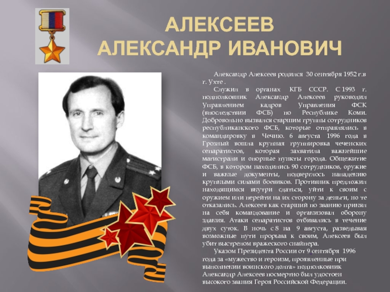 Указом Президента России от 9 сентября 1996 года за «мужество и героизм, проявленные при выполнении воинского долга» подполковник Александр Алексеев посмертно был удостоен высокого звания Героя Российской Федерации.