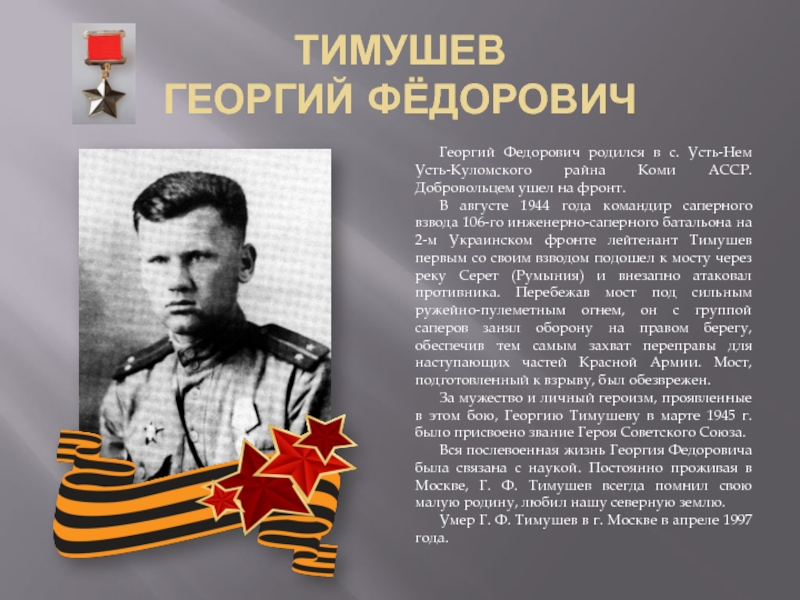 В данном альбоме представлены герои Советского Союза Российской Федерации, проживавшие в Республике Коми. Дополнительно представлена информация о Георгиевских кавалерах, уроженцах коми-зырянской земли, размещенной в пределах Архангельской и Северо-Двинской губерний Российской Империи.