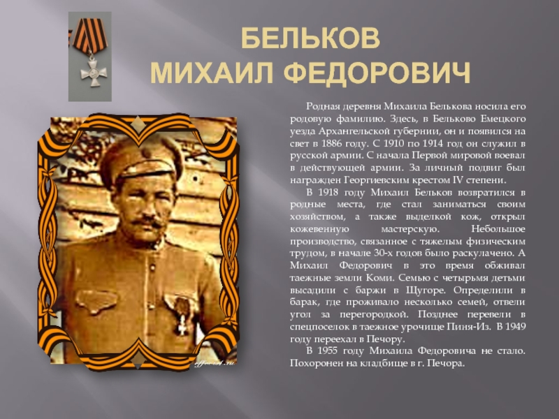 Белых. Он родился в 1876 году в деревне Гавриловской Палевицкой волости, куда возвратился с заслуженной наградой – Георгиевским крестом.