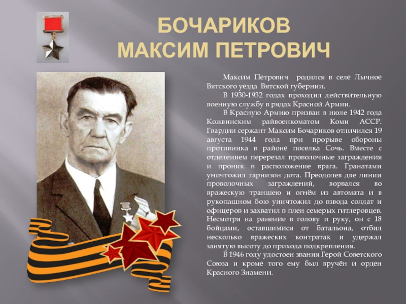 В Красную Армию призван в июле 1942 года Кожвинским райвоенкоматом Коми АССР. Гвардии сержант Максим Бочариков отличился 19 августа 1944 года при прорыве обороны противника в районе поселка Сочь. Вместе с отделением перерезал проволочные заграждения и проник в расположение врага. Гранатами уничтожил гарнизон дота. Преодолев две линии проволочных заграждений, ворвался во вражескую траншею и огнём из автомата и в рукопашном бою уничтожил до взвода солдат и офицеров и захватил в плен семерых гитлеровцев. Несмотря на ранение в голову и руку, он с 18 бойцами, оставшимися от батальона, отбил несколько вражеских контратак и удержал занятую высоту до прихода подкрепления.