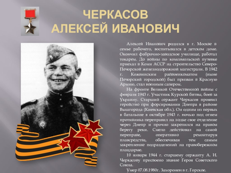 10 января 1944 г. старшему сержанту А. И. Черкасову присвоено звание Героя Советского Союза.