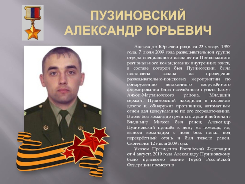 командования внутренних войск, в составе которой был Пузиновский, была поставлена задача на проведение разведывательно-поисковых мероприятий по обнаружению незаконного вооружённого формирования близ населённого пункта Бамут Ачхой-Мартановского района. Младший сержант Пузиновский находился в головном дозоре и, обнаружив противника, автоматным огнём дал целеуказание по его сосредоточению. В ходе боя командир группы старший лейтенант Владимир Михеев был ранен; Александр Пузиновский пришёл к нему на помощь, но, вынося командира с поля боя, попал под перекрёстный огонь и был тяжело ранен. Скончался 12 июля 2009 года.