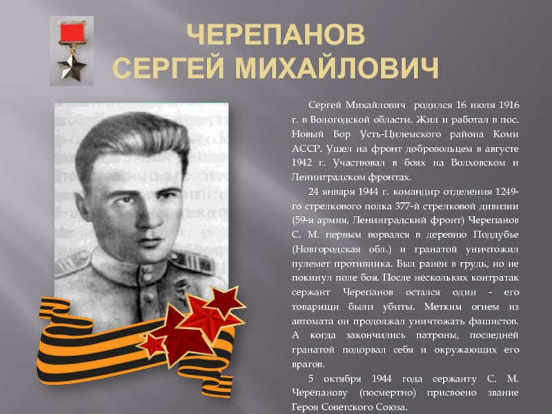 24 января 1944 г. командир отделения 1249-го стрелкового полка 377-й стрелковой дивизии (59-я армия, Ленинградский фронт) Черепанов С. М. первым ворвался в деревню Поддубье (Новгородская обл.) и гранатой уничтожил пулемет противника. Был ранен в грудь, но не покинул поле боя. После нескольких контратак сержант Черепанов остался один - его товарищи были убиты. Метким огнем из автомата он продолжал уничтожать фашистов. А когда закончились патроны, последней гранатой подорвал себя и окружающих его врагов.