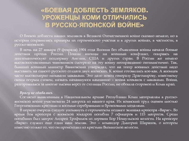 В ночь на 27 января (9 февраля) 1904 года Япония без объявления войны начала боевые действия против России. Пошли японцы на военный конфликт, опираясь на дипломатическую поддержку Англии, США и других стран. В России же немало высокопоставленных чиновников смотрело на эту войну неоправданно оптимистично. Так, бывший военный министр Ванновский утверждал, что на театр военных действий надо выставить на одного русского солдата двух японских. К войне готовились кое-как. А японцев часто высокомерно называли макаками. Это дало повод генералу Драгомирову, известному своим острым словом, назвать начавшуюся кампанию – война коекаков с макаками. Война, разгоревшаяся за многие тысячи верст от столицы России, не обошла стороной и Коми край.
