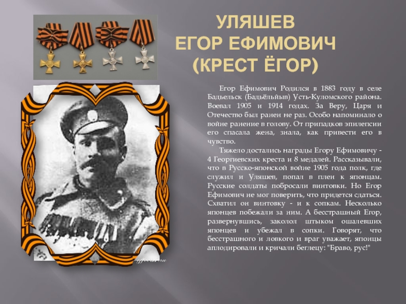 Тяжело достались награды Егору Ефимовичу - 4 Георгиевских креста и 8 медалей. Рассказывали, что в Русско-японской войне 1905 года полк, где служил и Уляшев, попал в плен к японцам. Русские солдаты побросали винтовки. Но Егор Ефимович не мог поверить, что придется сдаться. Схватил он винтовку - и к сопкам. Несколько японцев побежали за ним. А бесстрашный Егор, развернувшись, заколол штыком ошалевших японцев и убежал в сопки. Говорят, что бесстрашного и ловкого и враг уважает, японцы аплодировали и кричали беглецу: "Браво, рус!"