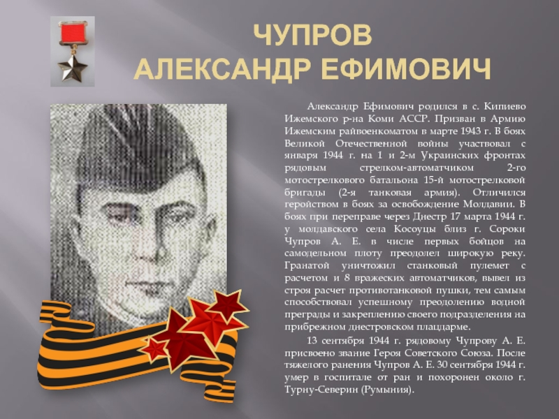 13 сентября 1944 г. рядовому Чупрову А. Е. присвоено звание Героя Советского Союза. После тяжелого ранения Чупров А. Е. 30 сентября 1944 г. умер в госпитале от ран и похоронен около г. Турну-Северин (Румыния).