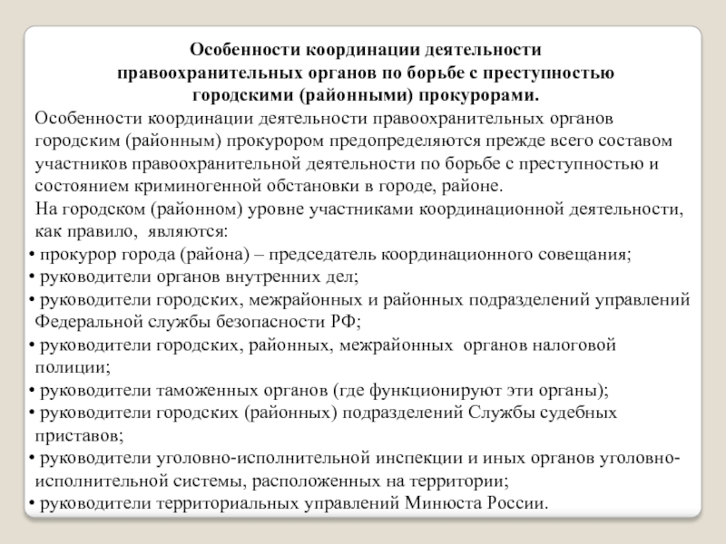 координации деятельности правоохранительных органов городским (районным) прокурором предопределяются прежде всего