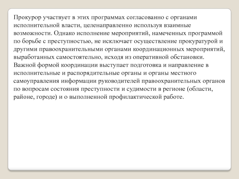Слайд 44Прокурор участвует в этих программах согласованно с органами исполнительной власти,