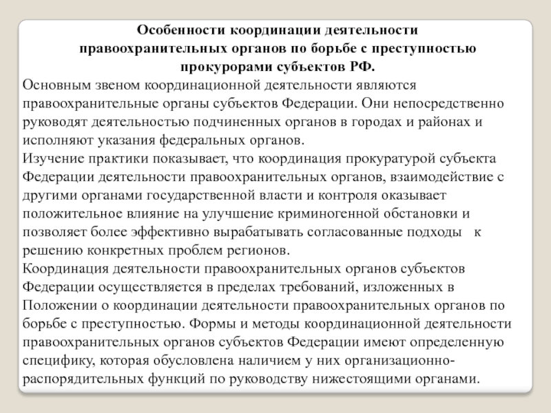 Координация деятельности правоохранительных органов субъектов Федерации осуществляется в пределах требований, изложенных в Положении о координации деятельности правоохранительных органов по борьбе с преступностью. Формы и методы координационной деятельности правоохранительных органов субъектов Федерации имеют определенную специфику, которая обусловлена наличием у них организационно-распорядительных функций по руководству нижестоящими органами.