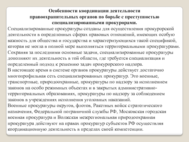 имеющих особую важность для общества и государства и характеризующихся такой спецификой, которая не могла в полной мере выполняться территориальными прокуратурами. Сохраняя за последними основные задачи, специализированные прокуратуры дополняют их деятельность в той области, где требуется специализация и определенный подход к решению задач прокурорского надзора.