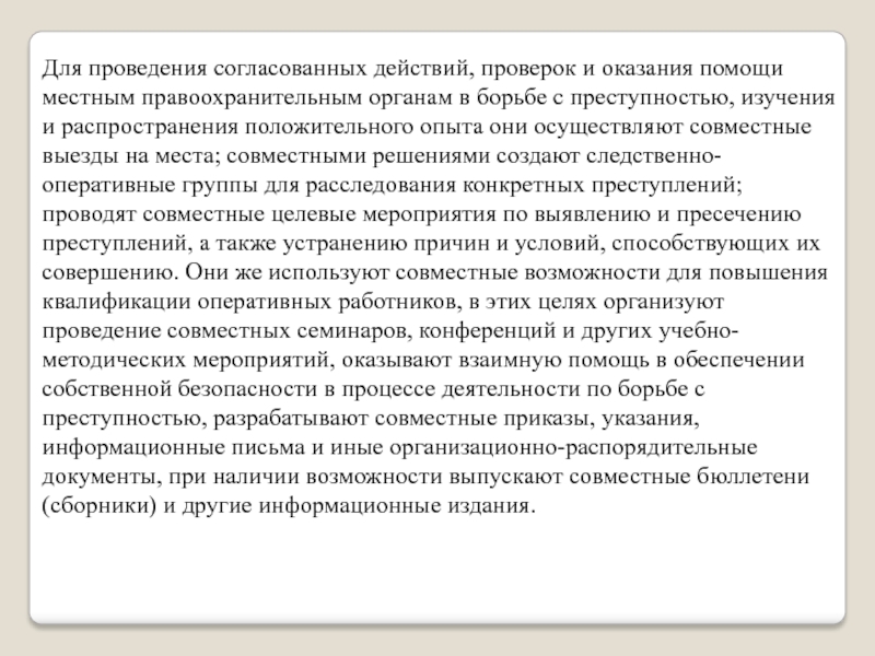 Слайд 34Для проведения согласованных действий, проверок и оказания помощи местным правоохранительным
