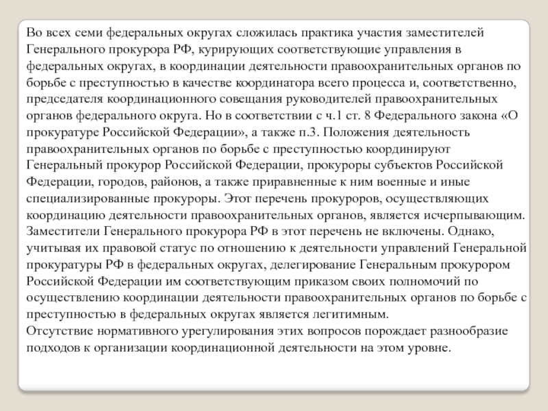 деятельности правоохранительных органов по борьбе с преступностью в качестве координатора всего процесса и, соответственно, председателя координационного совещания руководителей правоохранительных органов федерального округа. Но в соответствии с ч.1 ст. 8 Федерального закона «О прокуратуре Российской Федерации», а также п.3. Положения деятельность правоохранительных органов по борьбе с преступностью координируют Генеральный прокурор Российской Федерации, прокуроры субъектов Российской Федерации, городов, районов, а также приравненные к ним военные и иные специализированные прокуроры. Этот перечень прокуроров, осуществляющих координацию деятельности правоохранительных органов, является исчерпывающим. Заместители Генерального прокурора РФ в этот перечень не включены. Однако, учитывая их правовой статус по отношению к деятельности управлений Генеральной прокуратуры РФ в федеральных округах, делегирование Генеральным прокурором Российской Федерации им соответствующим приказом своих полномочий по осуществлению координации деятельности правоохранительных органов по борьбе с преступностью в федеральных округах является легитимным.