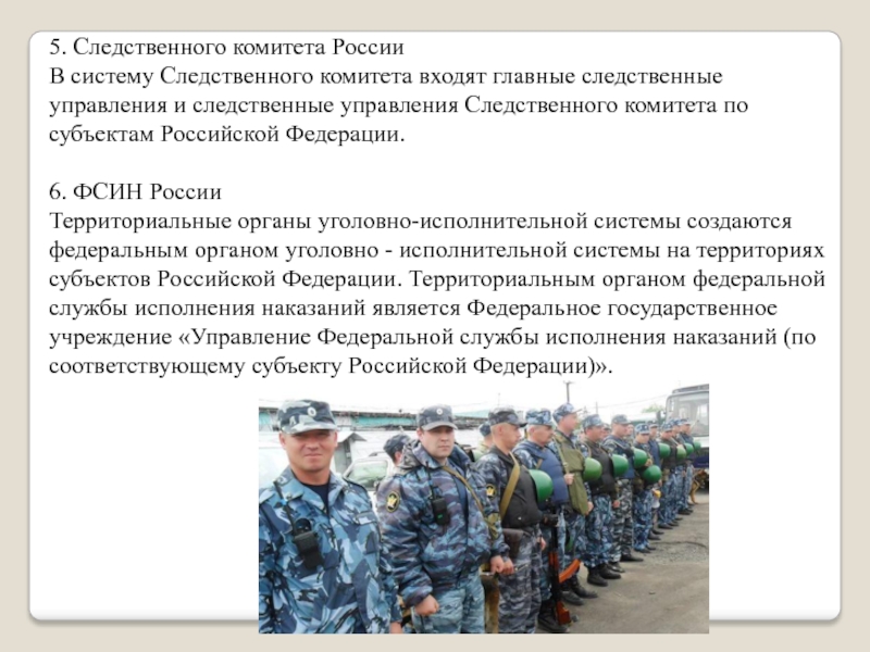 Как следует из приведенных положений законодательства, наряду с органами внутренних дел, ФСБ России, ФСКН России, таможенной службы (указанными в положении и законе, как участники координационной деятельности) правоохранительными функциями обладают: Следственный комитет Российской Федерации, органы Федеральной службы судебных приставов, органы государственного пожарного надзора федеральной противопожарной службы МЧС России, органы Федеральной службы исполнения наказаний, Федеральных органов государственной охраны, Служба внешней разведки Российской Федерации, командиры воинских частей и соединений, начальники военных учреждений и гарнизонов Вооруженных сил Российской Федерации, других войск, воинских формирований органов, в которых законом предусмотрена военная служба.