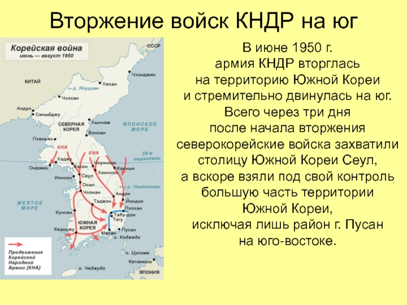 советские войска, южную — американские.Демаркационная линия была проведена по 38-й параллели.