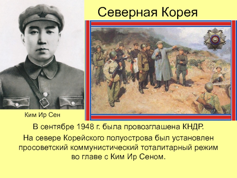 На севере в лидеры был выдвинут Ким Ир Сен, бывший партизанский командир, с 1940 г. живший в СССР и дослужившийся до майора Красной Армии.