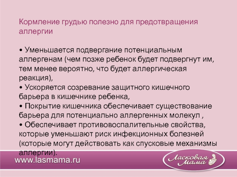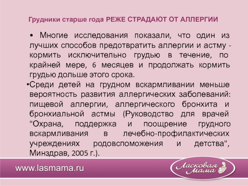 Среди детей на грудном вскармливании меньше вероятность развития аллергических заболеваний: пищевой аллергии, аллергического бронхита и бронхиальной астмы (Руководство для врачей "Охрана, поддержка и поощрение грудного вскармливания в лечебно-профилактических учреждениях родовспоможения и детства", Минздрав, 2005 г.).