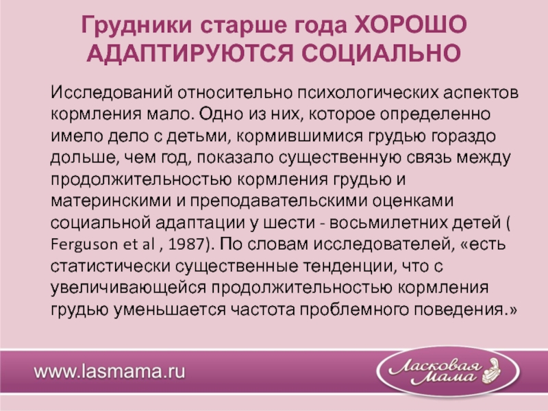 кормившимися грудью гораздо дольше, чем год, показало существенную связь между продолжительностью кормления грудью и материнскими и преподавательскими оценками социальной адаптации у шести - восьмилетних детей ( Ferguson et al , 1987). По словам исследователей, «есть статистически существенные тенденции, что с увеличивающейся продолжительностью кормления грудью уменьшается частота проблемного поведения.»