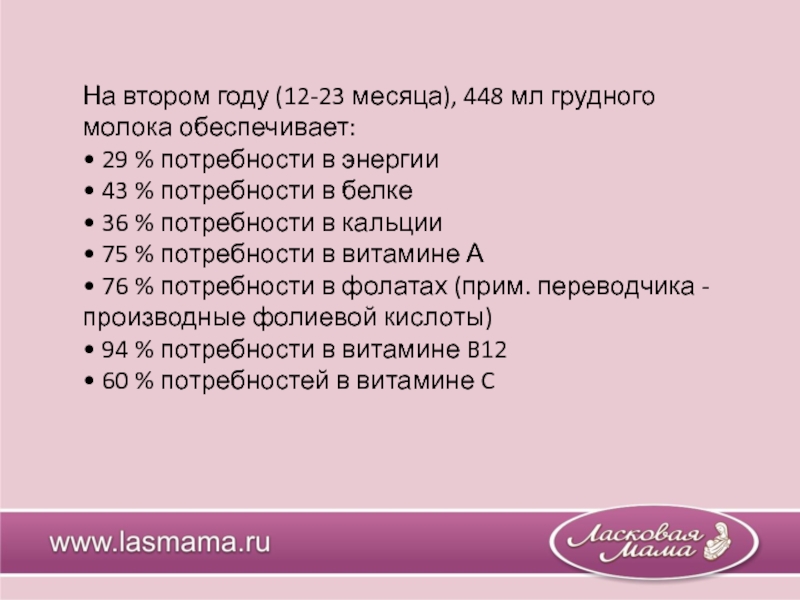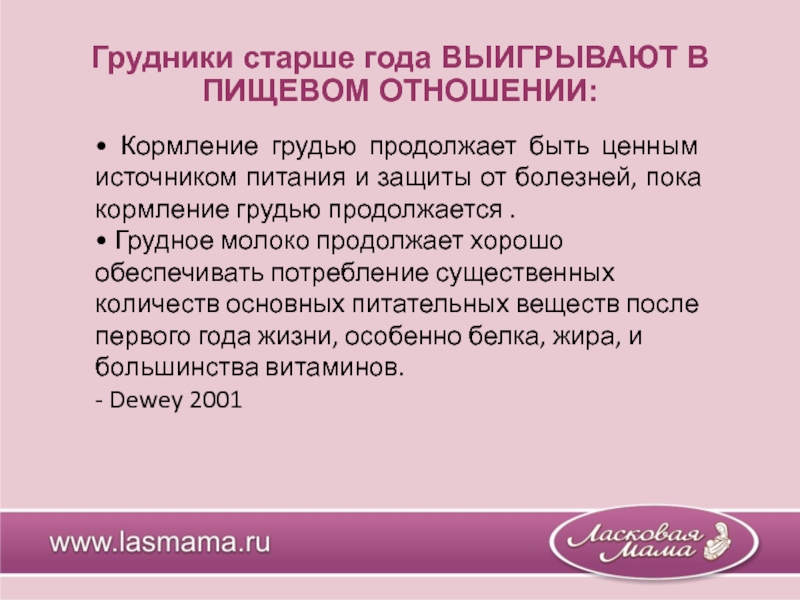 • Грудное молоко продолжает хорошо обеспечивать потребление существенных количеств основных питательных веществ после первого года жизни, особенно белка, жира, и большинства витаминов.
