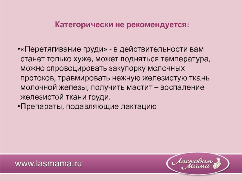 травмировать нежную железистую ткань молочной железы, получить мастит – воспаление железистой ткани груди.