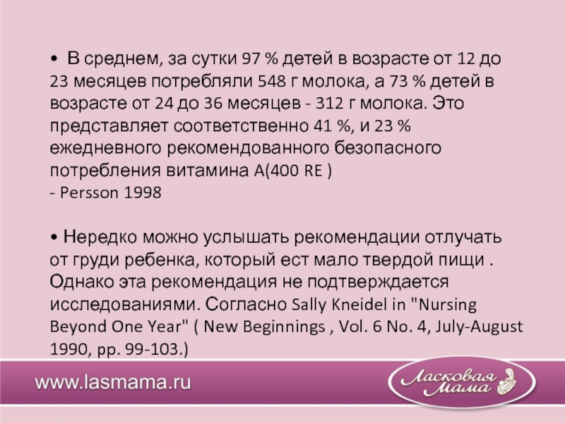 • Нередко можно услышать рекомендации отлучать от груди ребенка, который ест мало твердой пищи . Однако эта рекомендация не подтверждается исследованиями. Согласно Sally Kneidel in "Nursing Beyond One Year" ( New Beginnings , Vol. 6 No. 4, July-August 1990, pp. 99-103.)